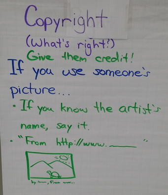 It’s really wonderful when someone puts what you know into words so eloquently. So, with the these two big takeaways from the session in mind, I went to work with my third graders and their blog posts. We discussed the idea of honesty, and the importance of giving credit. We discussed what kind of information we should share about sources and came up with this poster: