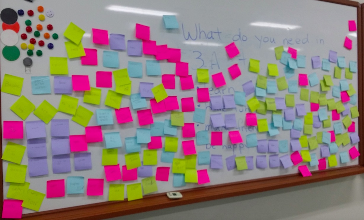 Then, I ask the students, what do you need in a classroom so that you can make this successful? I had the students write their ideas on a post-it and stuck it up on a wall:
